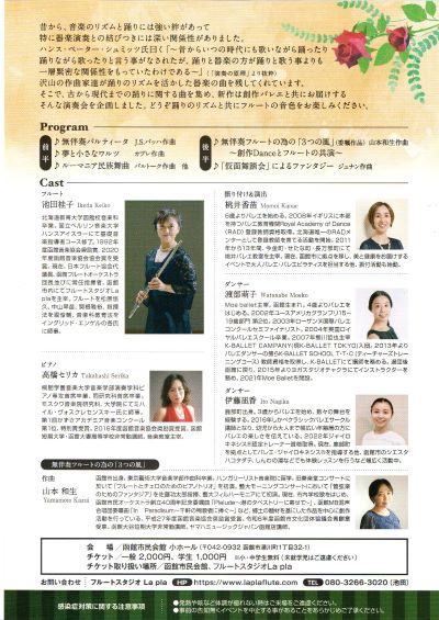 今回は、フルートソロ曲に加え、ダンサーの渡部萌子氏と伊藤凪香氏(振り付け&演出 桃井香苗氏)とフルート曲の新曲《作曲 山本和生氏》もあり、皆様にお楽しみいただけるプログラムとなっております(^^♪