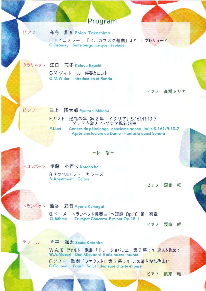 高校生~大学生による全6ステージのプログラム(ピアノ・クラリネット・トロンボーン・トランス・テノール)になります♪