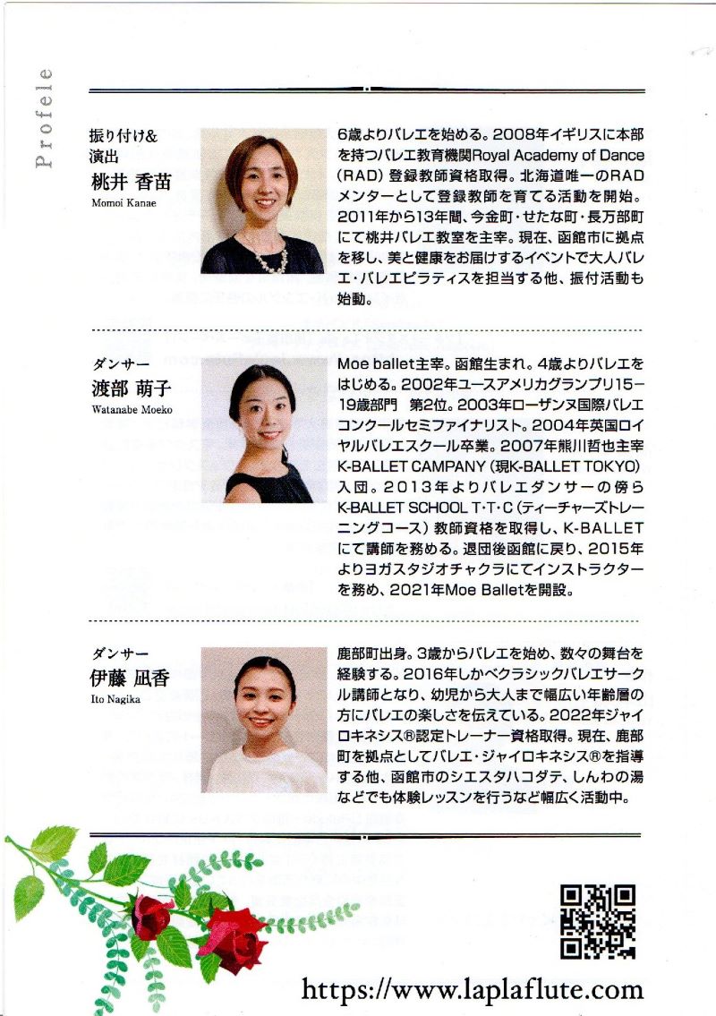 毎年、その年のテーマに添って、他の共演者とのプログラムも織り交ぜながら構成されているコンサートですが、今回はバレエダンサーの渡部萌子さんと伊藤凪香さん、振付&演出で桃井香苗さんとフルート演奏♪というプログラムもあり、普段の音楽コンサートとは一味違ったコンサートとなりました