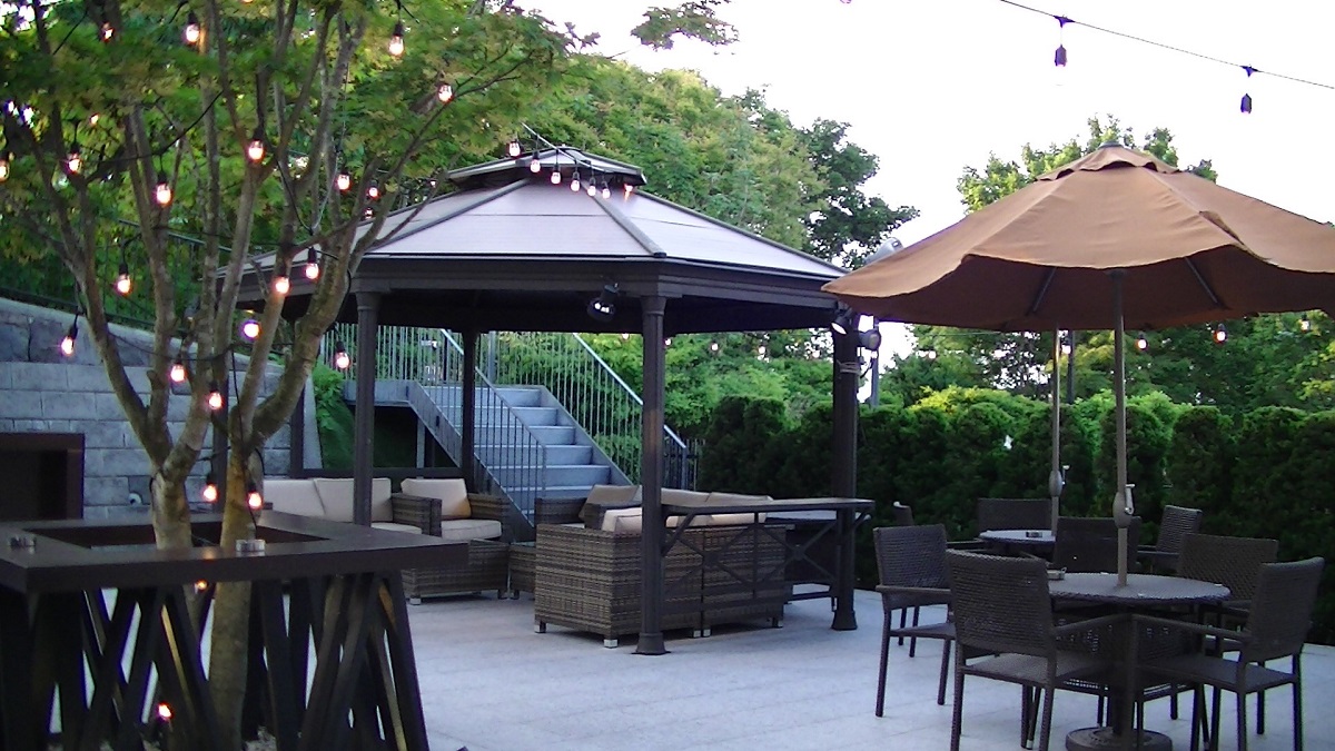 )は、清潔感のある白い壁に大きな鏡がたくさんあり、窓からはたくさんの日差しが入る明るいお部屋。また、外のテラスも一瞬日本であることを忘れてしまうような優雅なテラスで、夜になるとまたロマンチックな感じ
