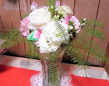 ちょっと変わった真ん中の白いお花は「ラナンキュラス」です。