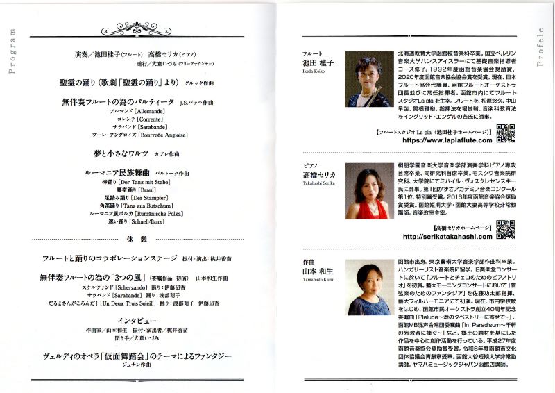 今回は、フルートソロ曲に加え、ダンサーの渡部萌子氏と伊藤凪香氏(振り付け&演出 桃井香苗氏)とフルート曲の新曲《作曲 山本和生氏》もあり、皆様にお楽しみいただけるプログラムとなっております(^^♪